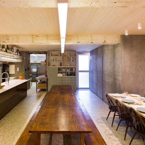 S orprende tras su modestísima fachada, un tanto retro, pues esta da paso a un comedor de ambiente tradicional en el que te sentirás como en casa. El local, con originales sillones corridos en los laterales, una gran mesa central compartida y detalles estructurales en hormigón visto, apoya la idea de buscar la cocina casera de siempre, esa que ensalza los sabores de la infancia y que el chef denomina "de barrio". Ofrecen empanada casera y muchos platos para compartir, con un eje básico que gira en torno a los escabeches, los guisos y los pescados frescos del día.