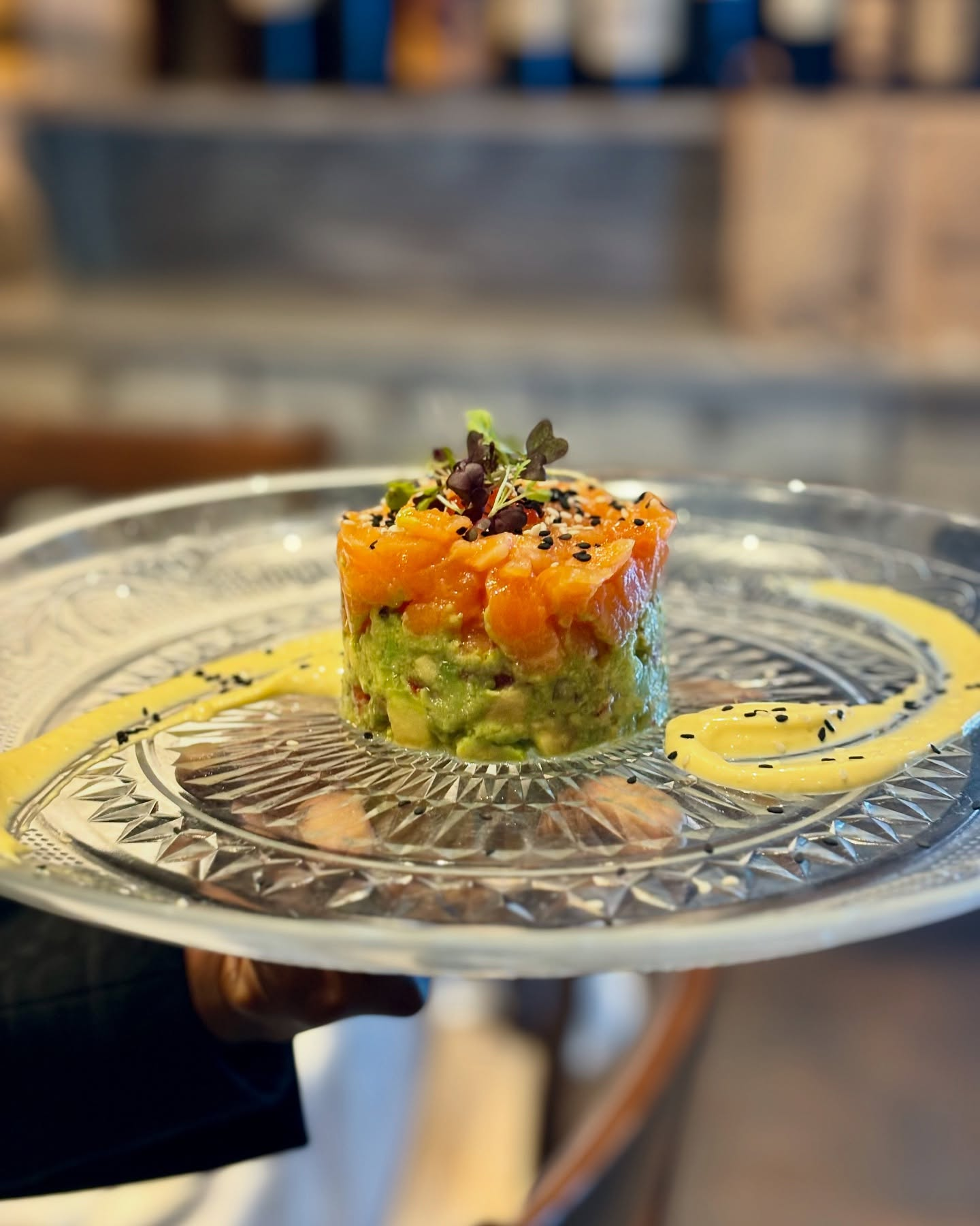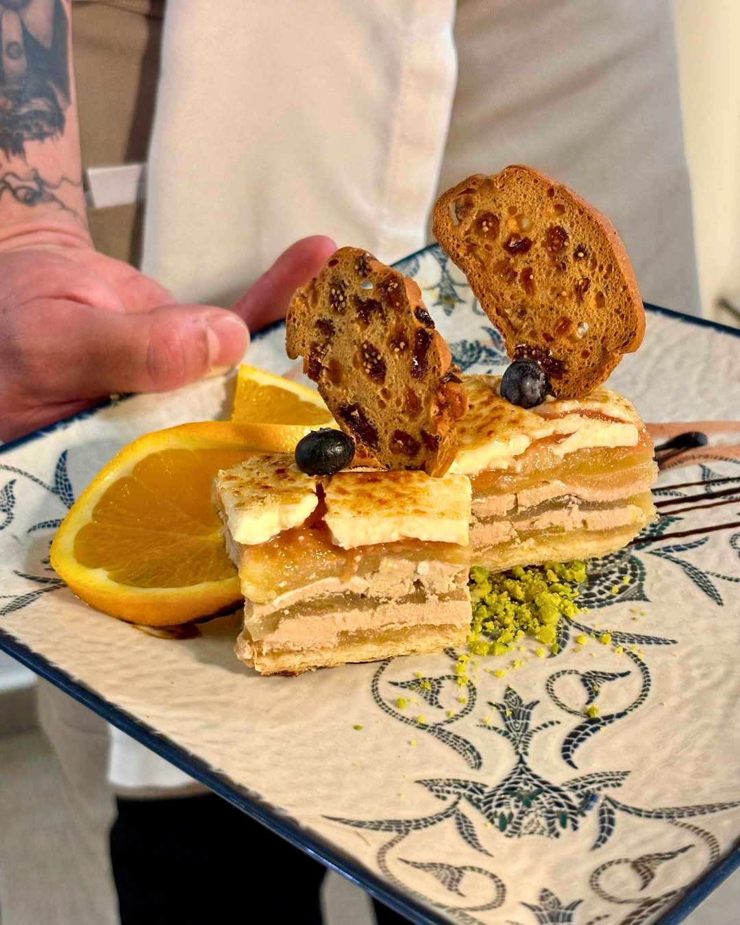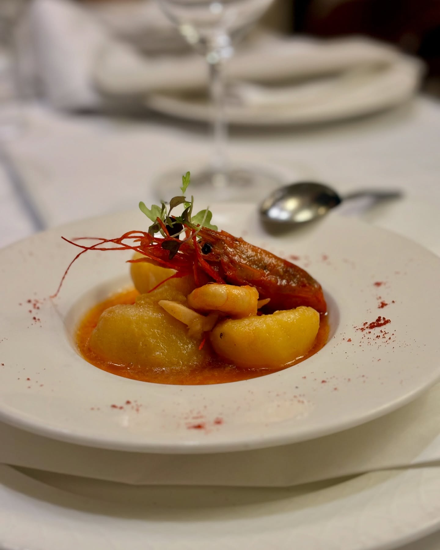 Gambas de Huelva al ajillo, tartar de aguacate y carabinero, costillas de cordero, magret de pato con salsa de vino de Oporto, chocolate fondant.