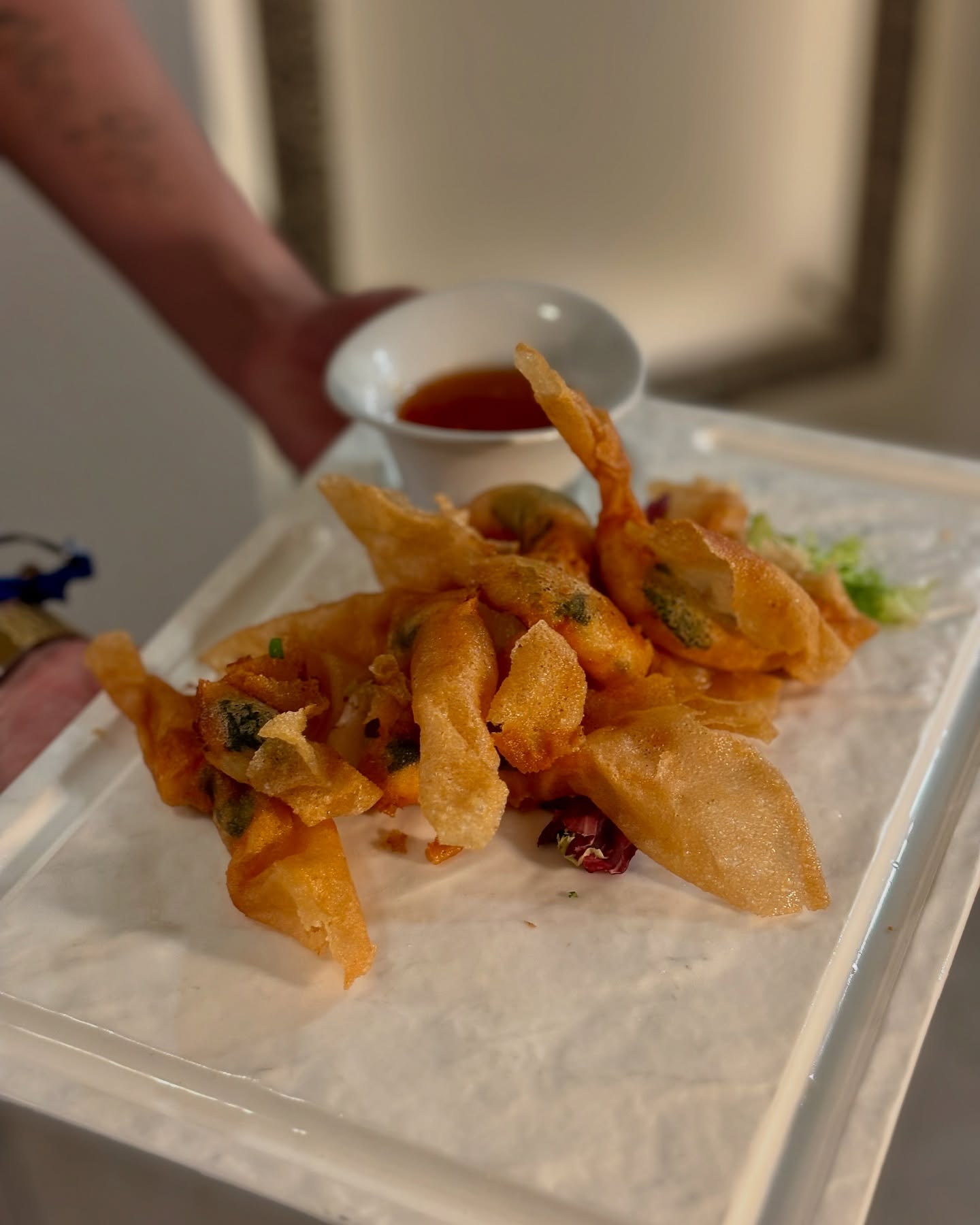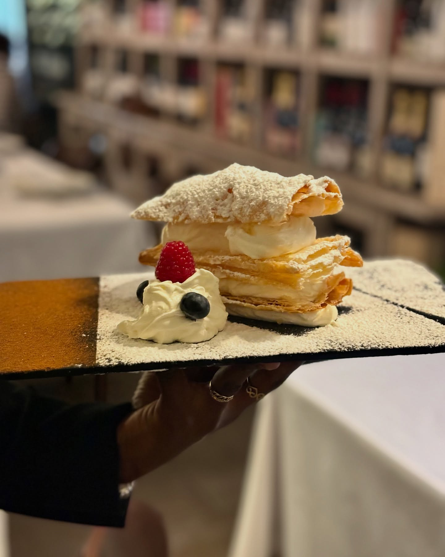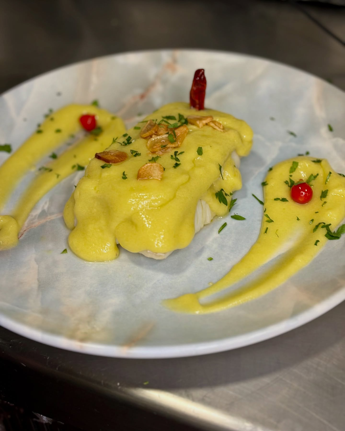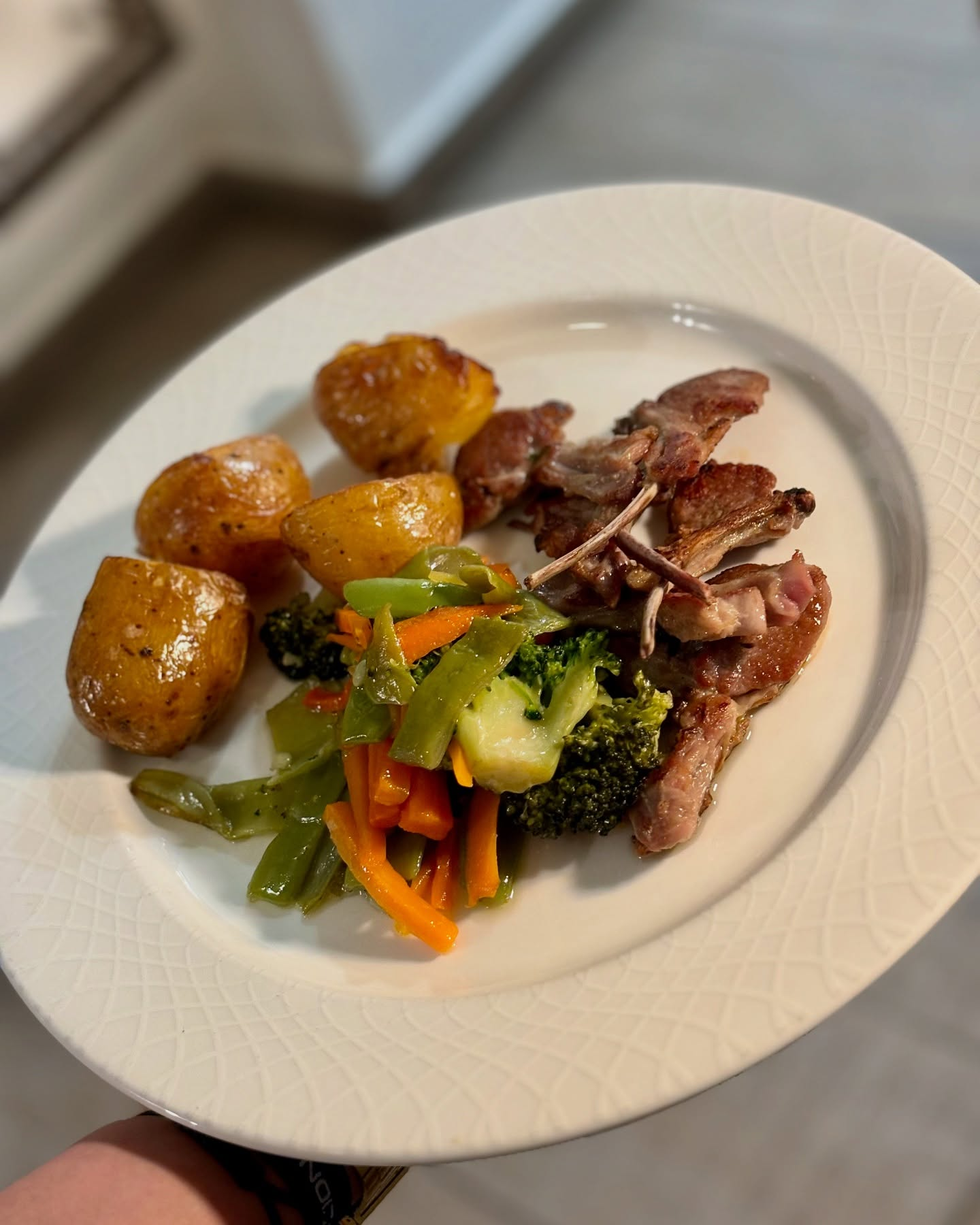Gambas de Huelva al ajillo, tartar de aguacate y carabinero, costillas de cordero, magret de pato con salsa de vino de Oporto, chocolate fondant.