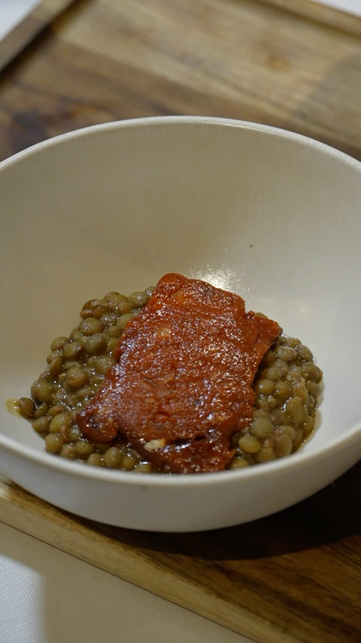 Torreznos de papada ibérica asados y fritos, croquetas de huevo frito y leche fresca, pimiento relleno de bechamel de bacalao en salsa vizcaína, foie mi-cuit marinado en moscatel, callos a la madrileña,cordero lechal, cochinillo al horno.