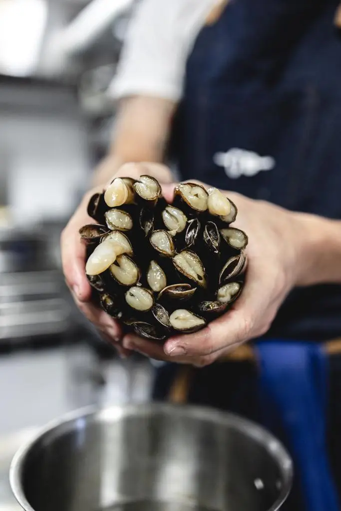 Navajas al pil‑pil con mojo verde; tortilla rellena de manitas; albóndigas de aguja de cerdo; merluza gallega 2.0; filloa de cocido con emulsión de espinacas; fresas con nata y sésamo garrapiñado