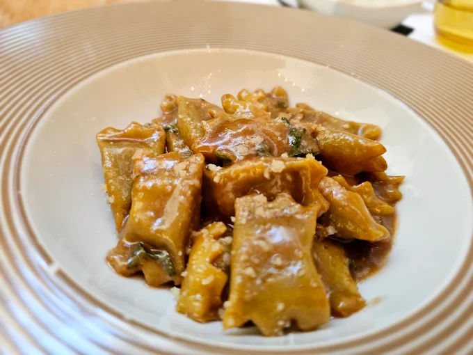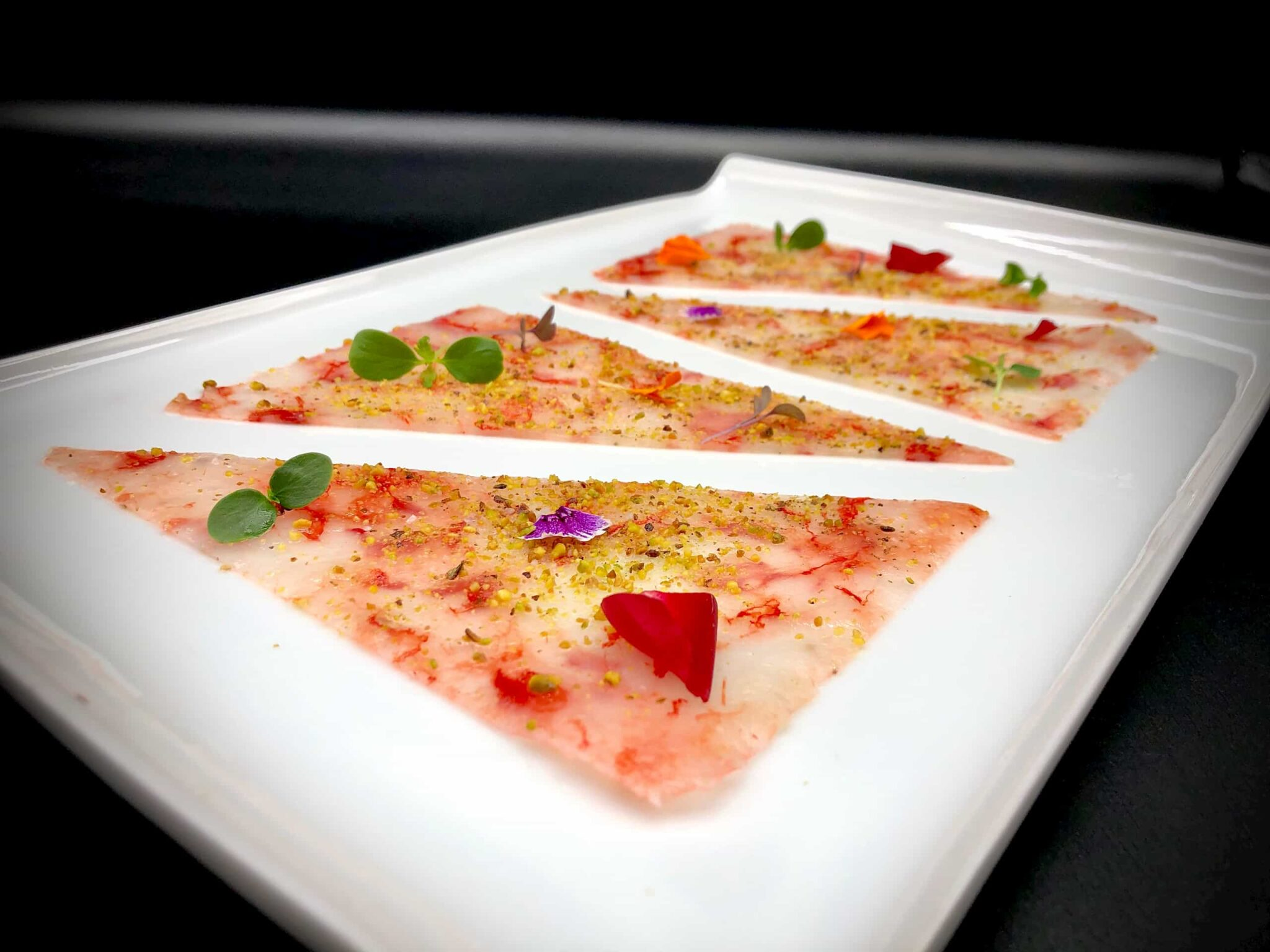 Pasta casera (raviolini del “Plin”, fregola sarda con almejas), bucatini carbonara auténtica, carpaccio de scampi, risotto al gorgonzola.