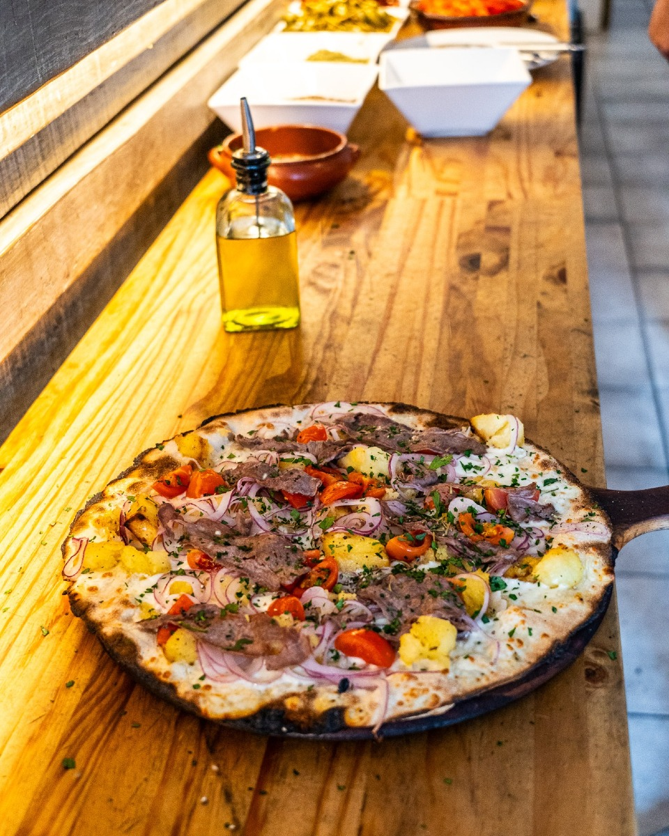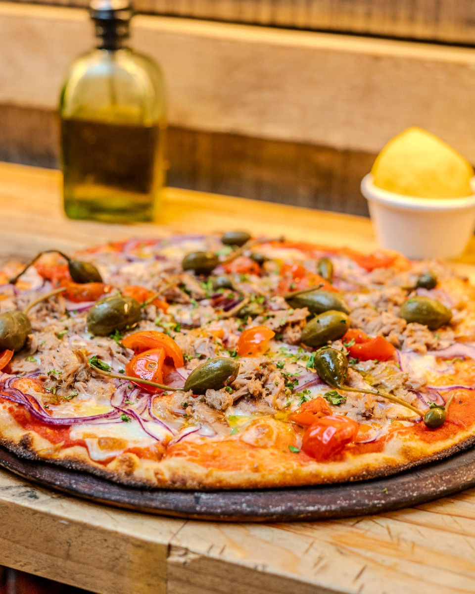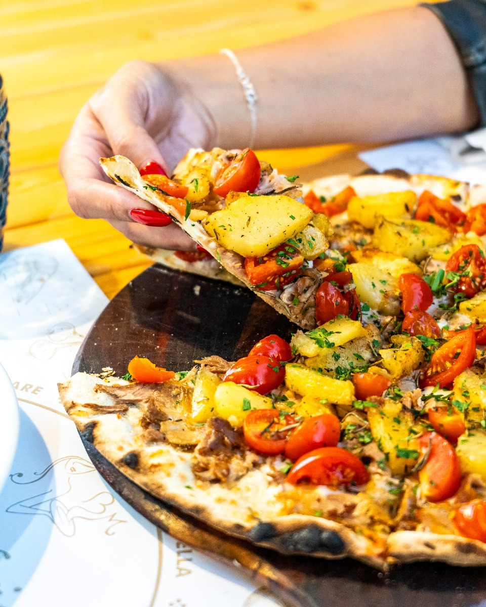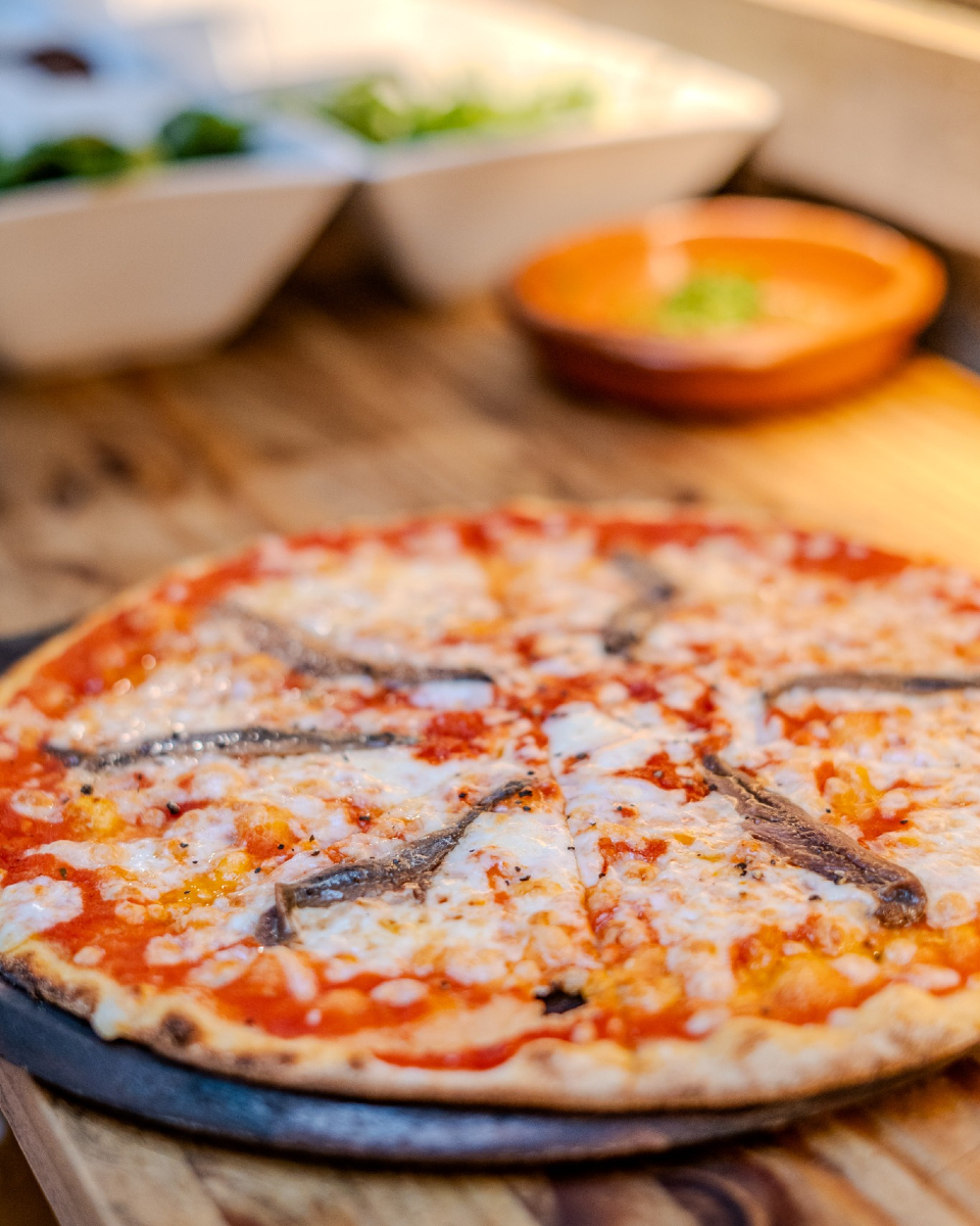 Pizzas gourmet (margarita, burrata, opciones sin gluten), ensaladas con tomate seco, panna‑cotta, pizza de Nutella.