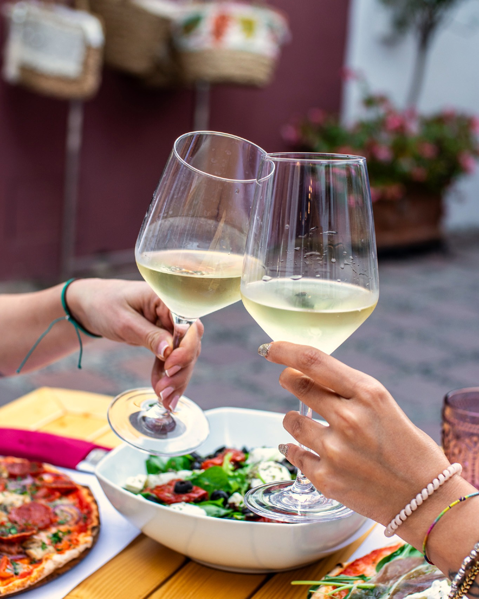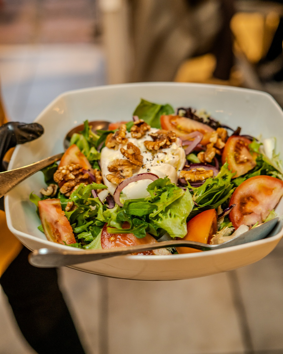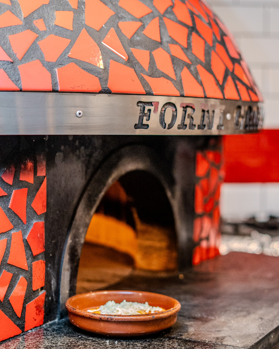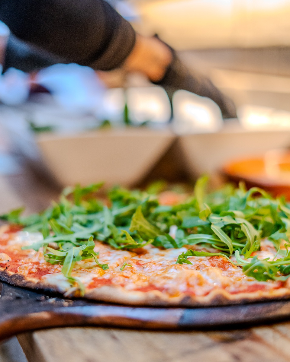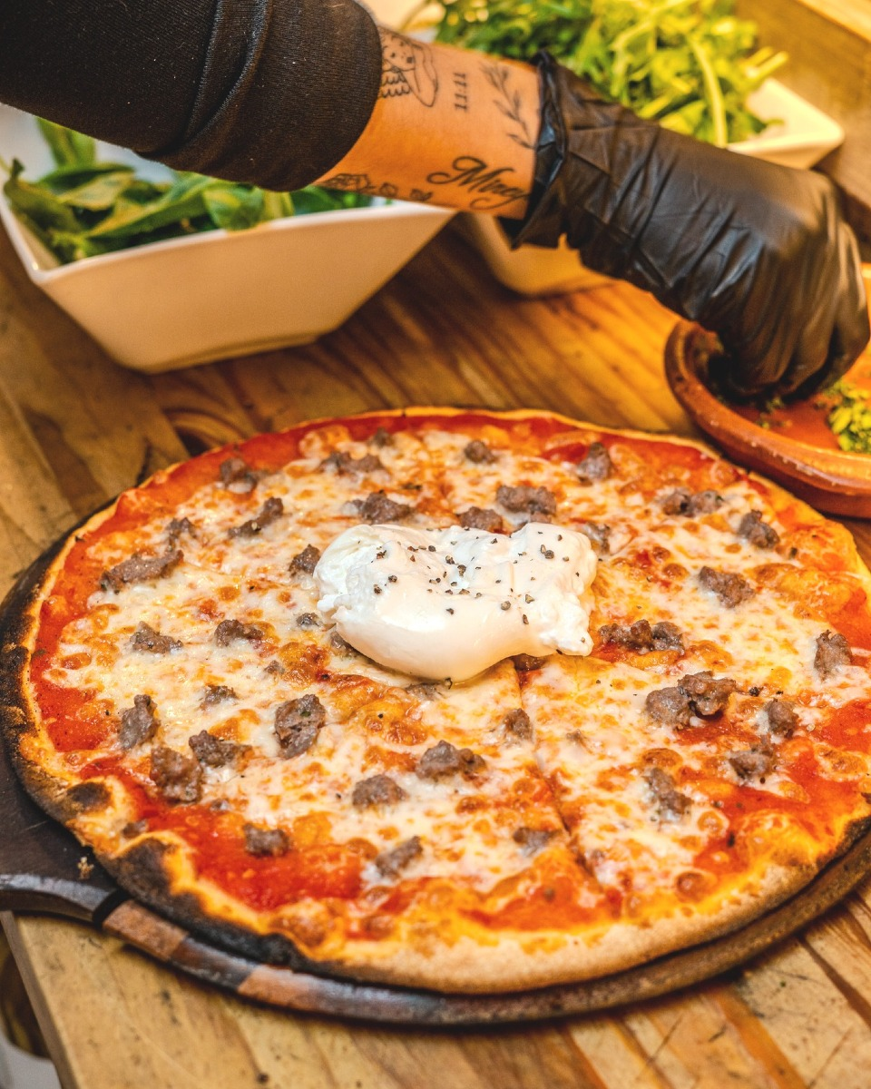 Pizzas gourmet (margarita, burrata, opciones sin gluten), ensaladas con tomate seco, panna‑cotta, pizza de Nutella.