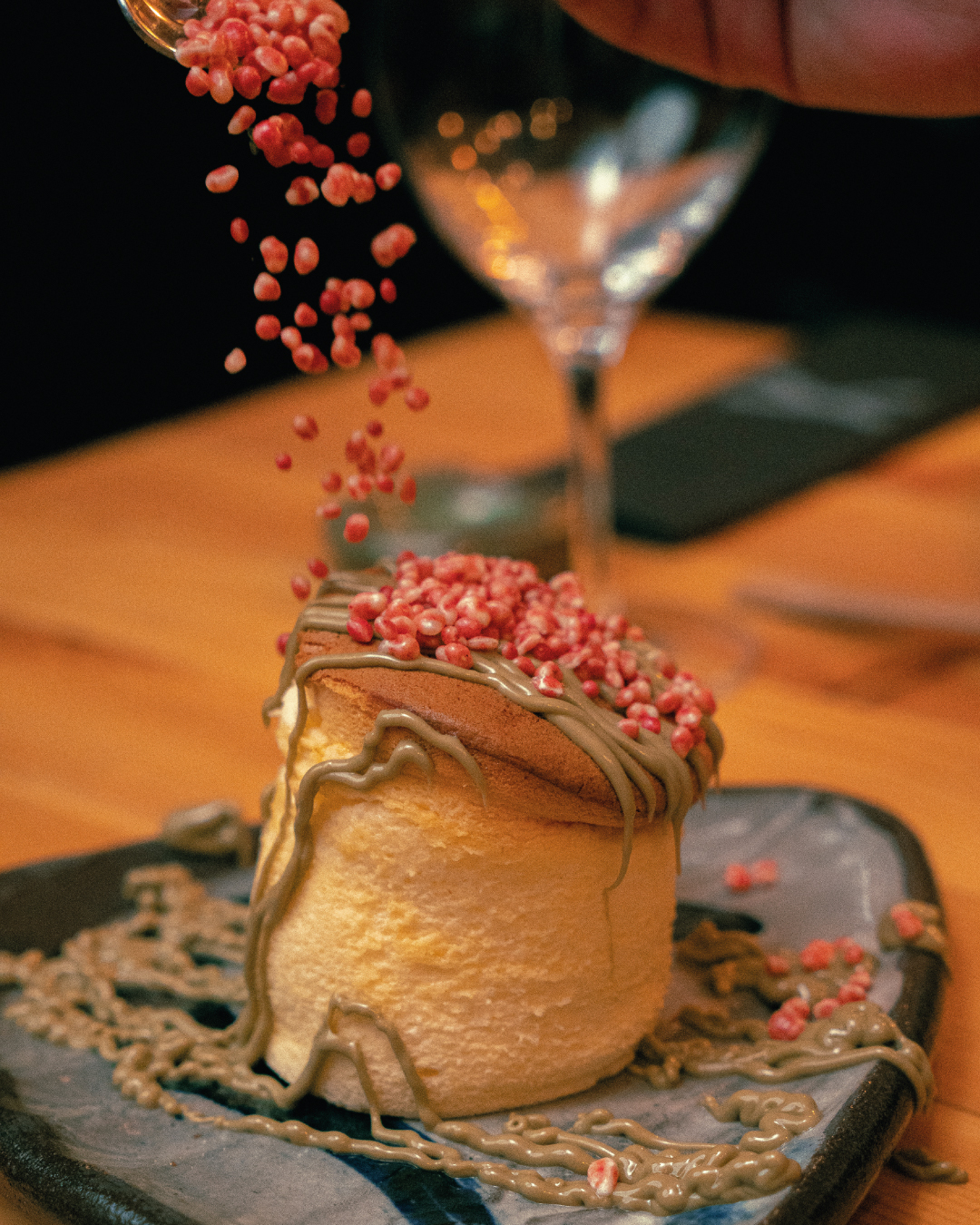 Tarta esponjosa cotton cheesecake con chocolate fondant y algodón de azúcar. (Puede contener trazas de cacahuetes, frutos de cáscara, soja y mostaza)