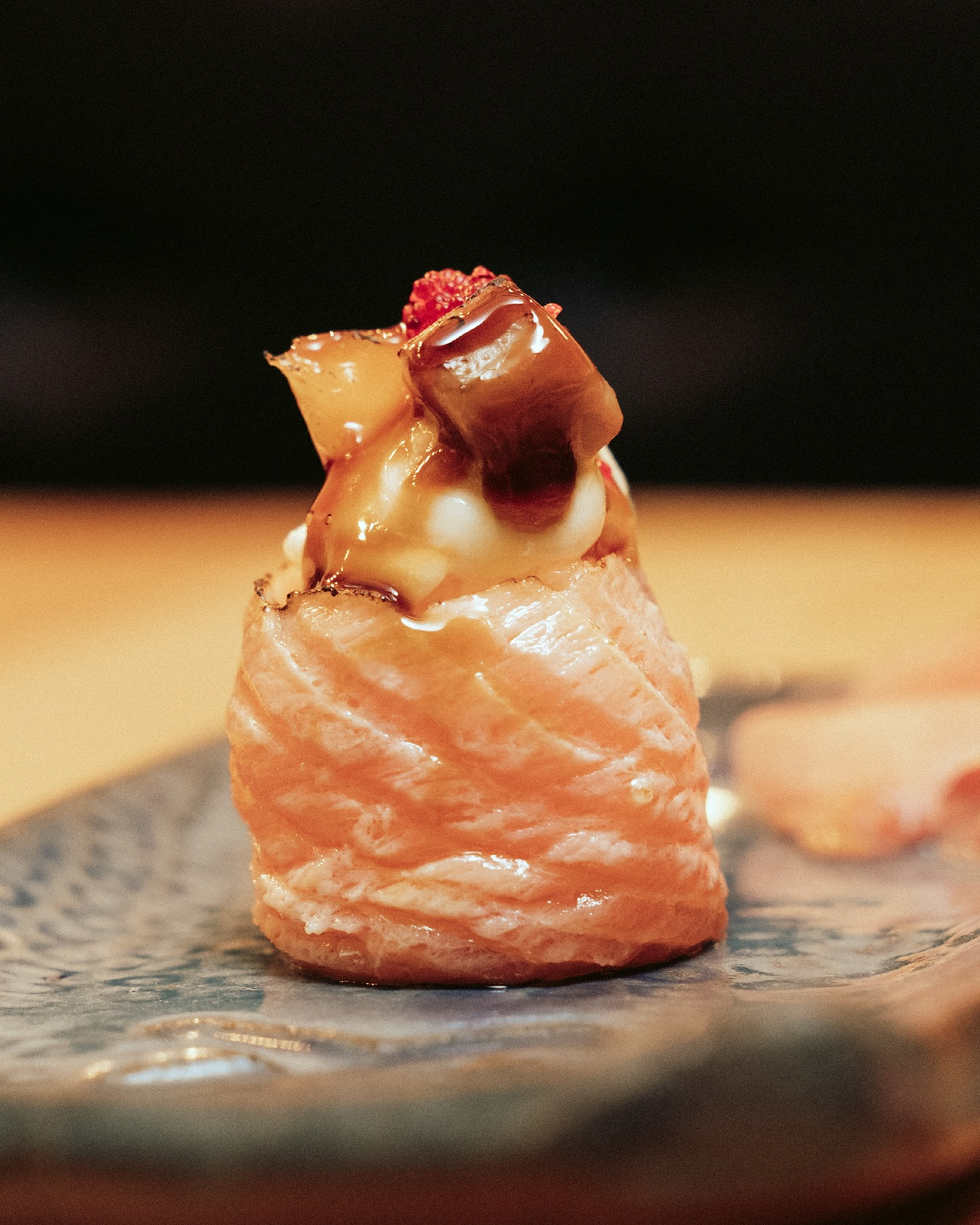Salmón marinado en tacos, aguacate y pepino cubierto de salmón, mahonesa japonesa e ikura (PICANTE)