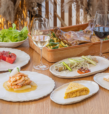 Tortilla caviar, ensaladilla rusa con jamón ibérico, milhojas de foie y queso de cabra, croquetas de bacalao, presa ibérica, tarta de queso casera.