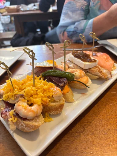 Pincho cojonudo; mini kebap de pollo; tortilla de camarones; hamburguesita de atún; patatas bravas; baolola (langostinos alioli pil‑pil)