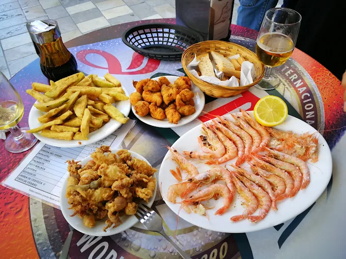 Pescaíto frito variado (adobo, calamares, boquerones, rosada, camarones), gambas cocidas o a la plancha, mejillones al vapor .