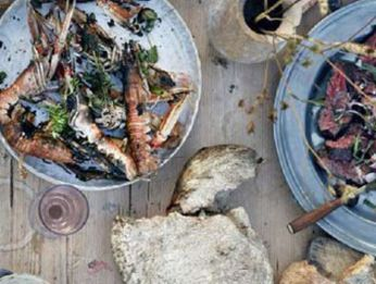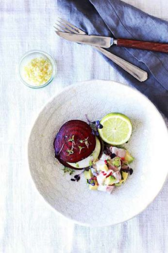 Tapa de carbón de bacalao en tinta, dumplings con salsa, risotto de calabacín y trufa, twister de langostinos, patatas bravas y caprese fresca.