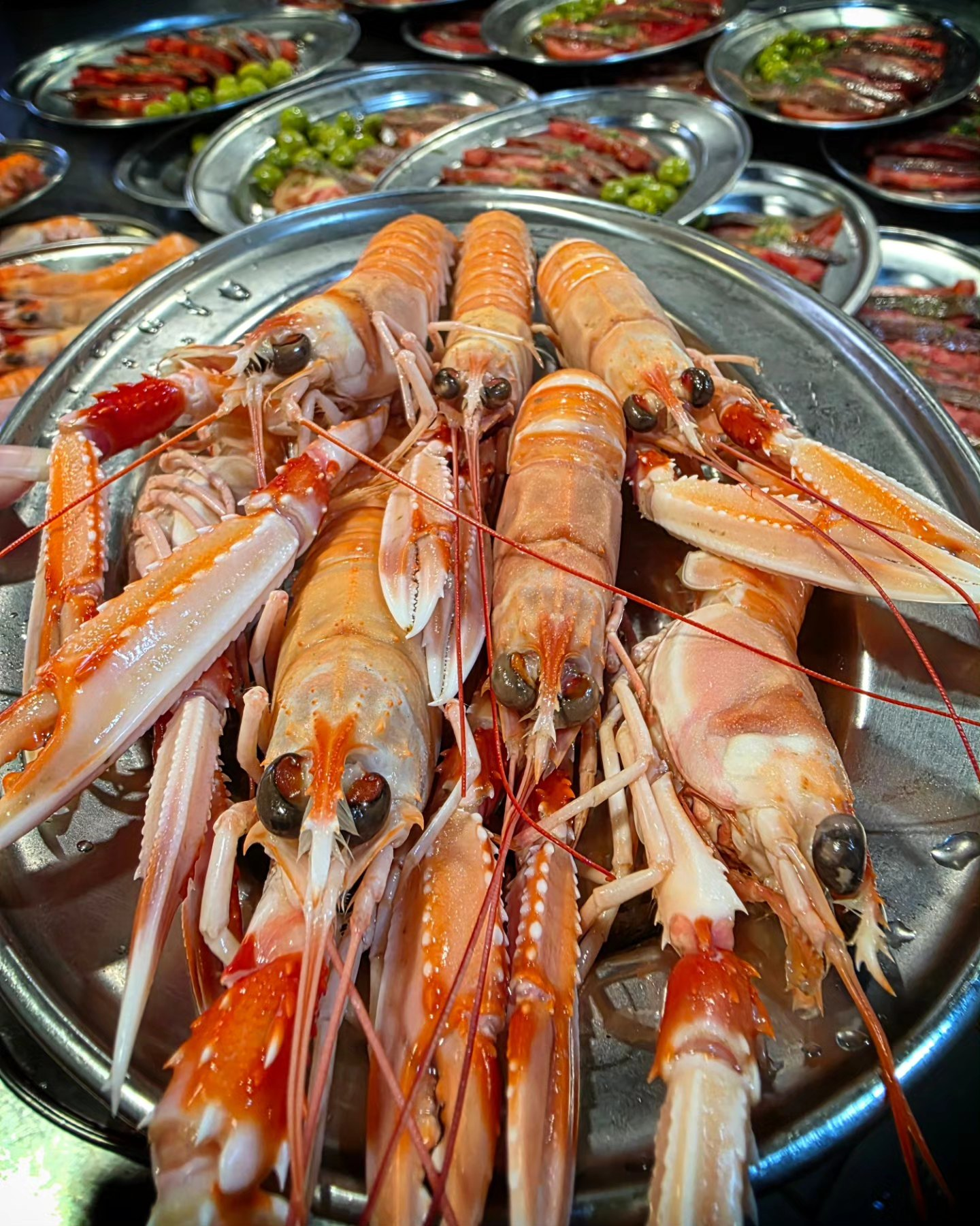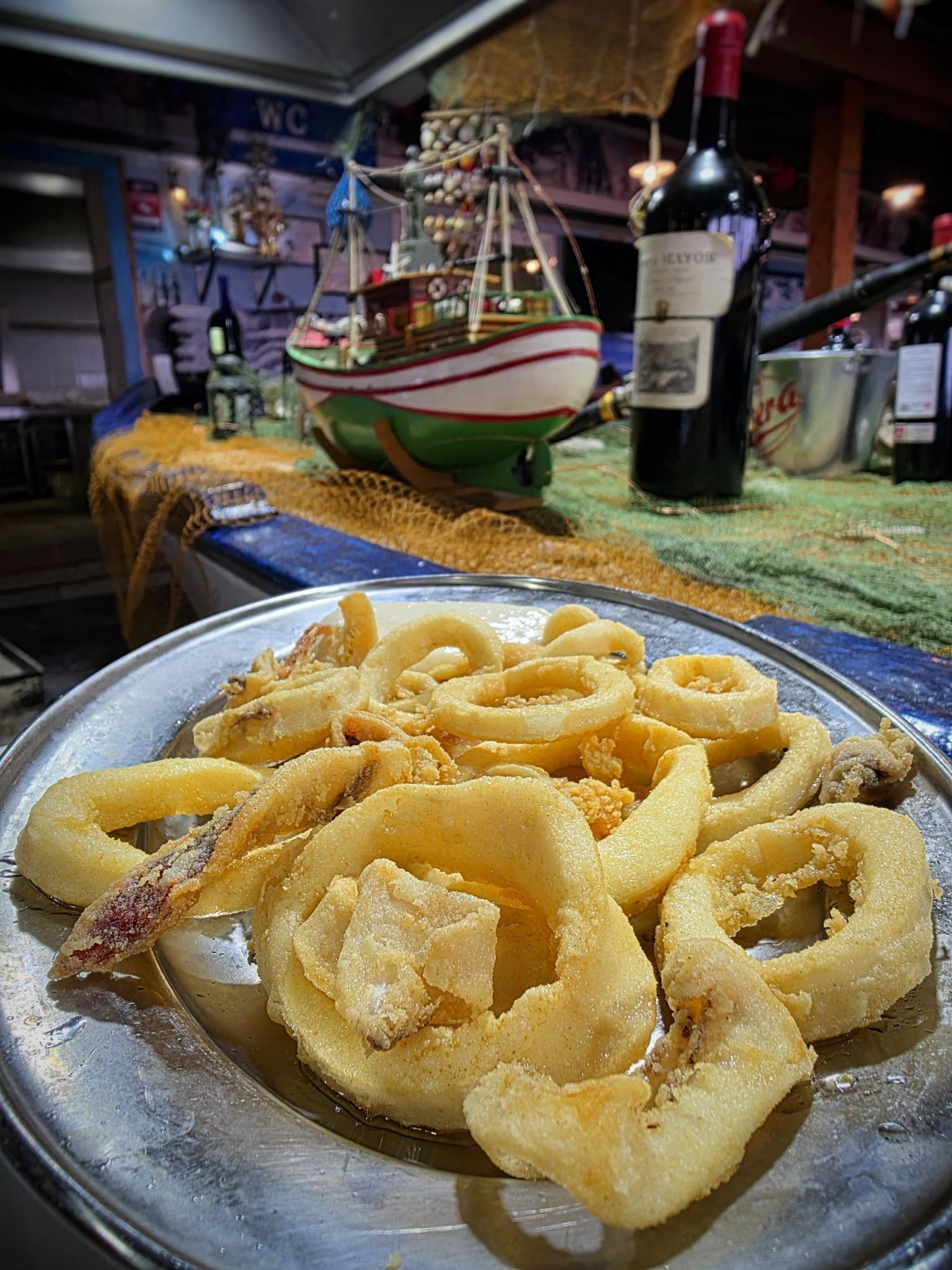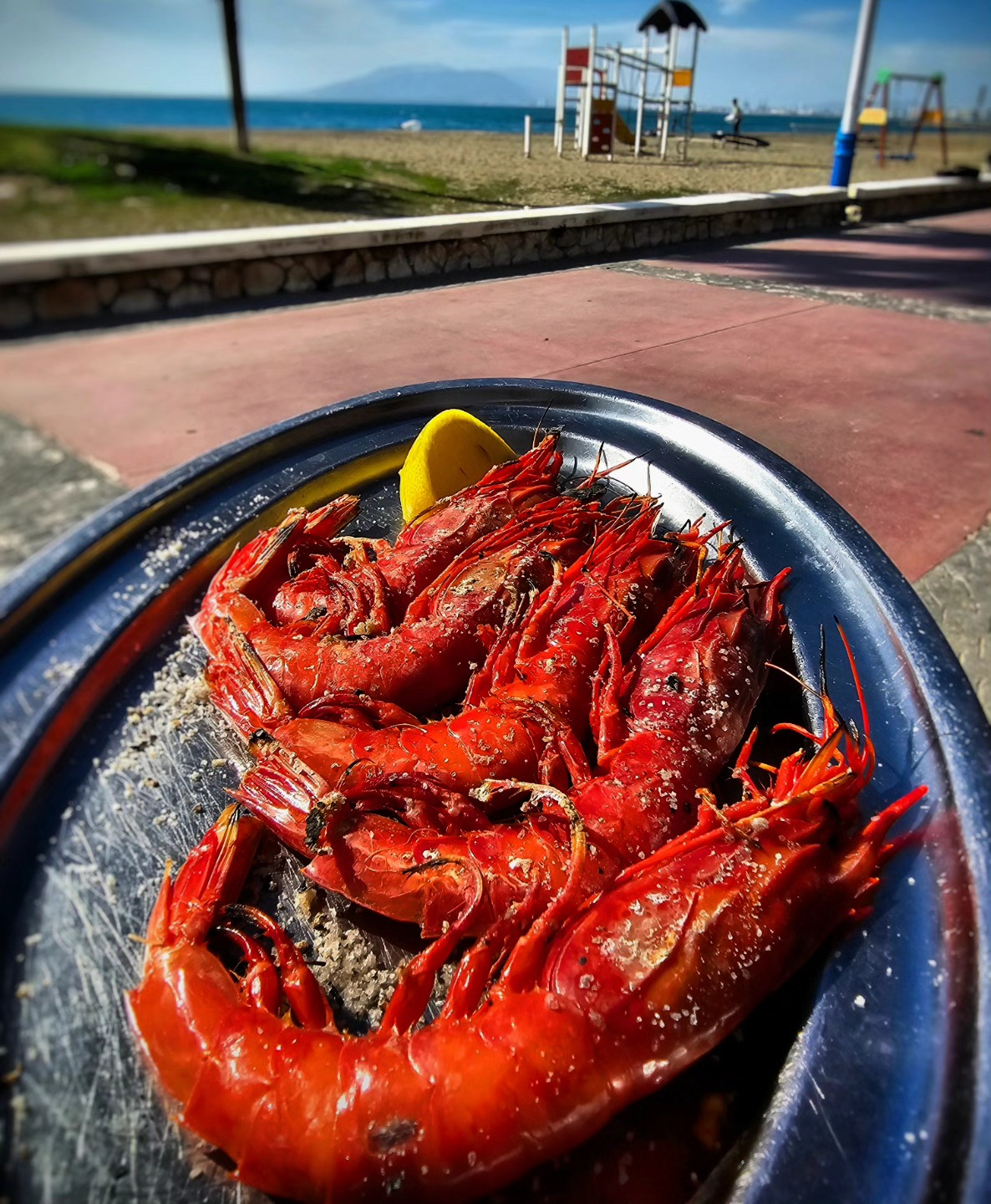 Espetos de sardinas, pescaíto frito variado (boquerones, calamares, chopitos, salmonetes), mariscos frescos, pescados a la brasa.