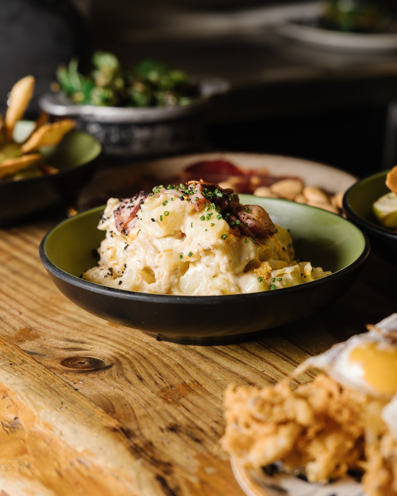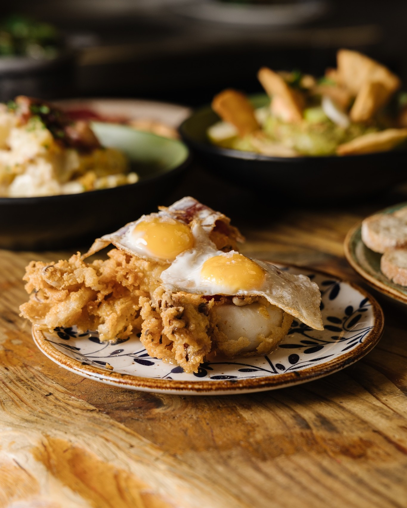 Ensaladilla rusa con pulpo gallego; octopus‑burger; tartar de atún rojo con aguacate; gyozas de rabo de toro con foie; bravas gourmet; croquetas de gambas al pil‑pil; bao de cochinita pibil; fideuá de pato con foie