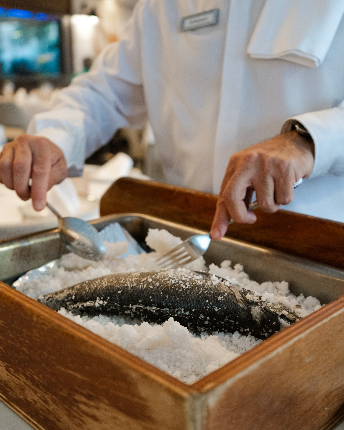 Pescados a la sal, pescados al horno, fideuá, arroces marineros, zarzuela de mariscos, postres clásicos como crema catalana.