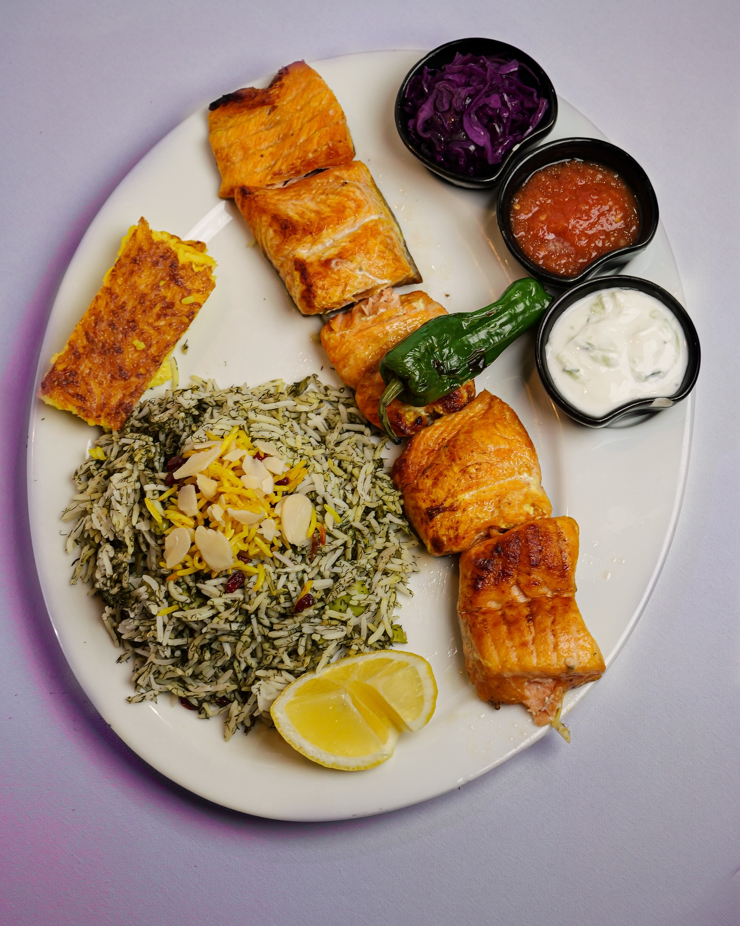 kebabs persas, guisos iraníes, arroces aromáticos, platos vegetarianos, postres tradicionales persas