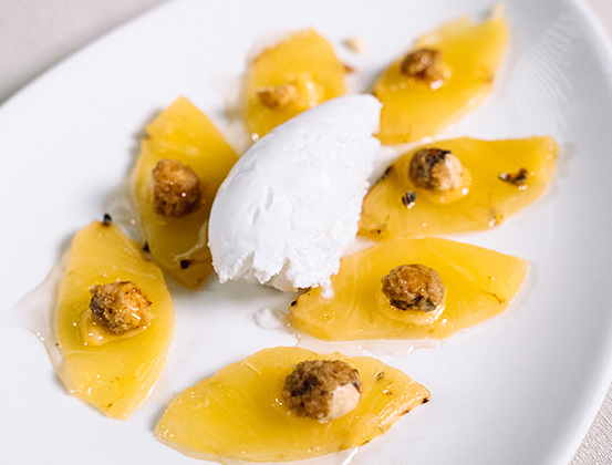 Chuleta deshuesada a la parrilla, rodaballo al carbón, gambas de Huelva, verduras asadas, tarta de queso con helado de leche merengada.